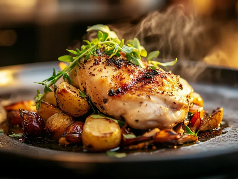 Vérifiez la cuisson : piquez la cuisse, le jus doit être clair. Laissez reposer 10 minutes avant de découper.