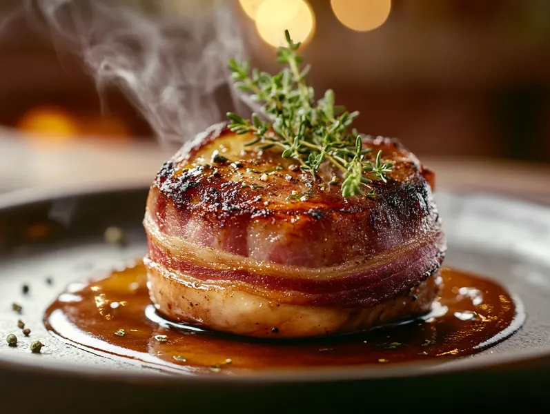Enroulez les tranches de poitrine fumée autour du filet. Ficelez si nécessaire.
